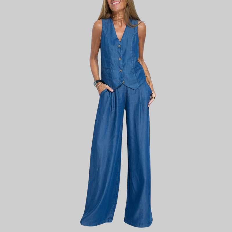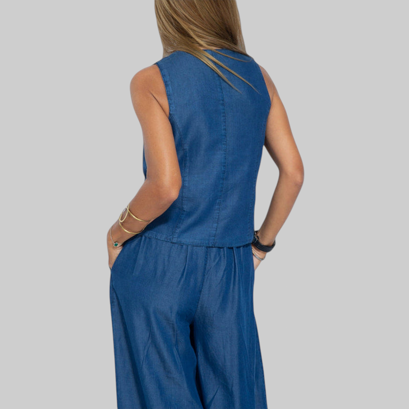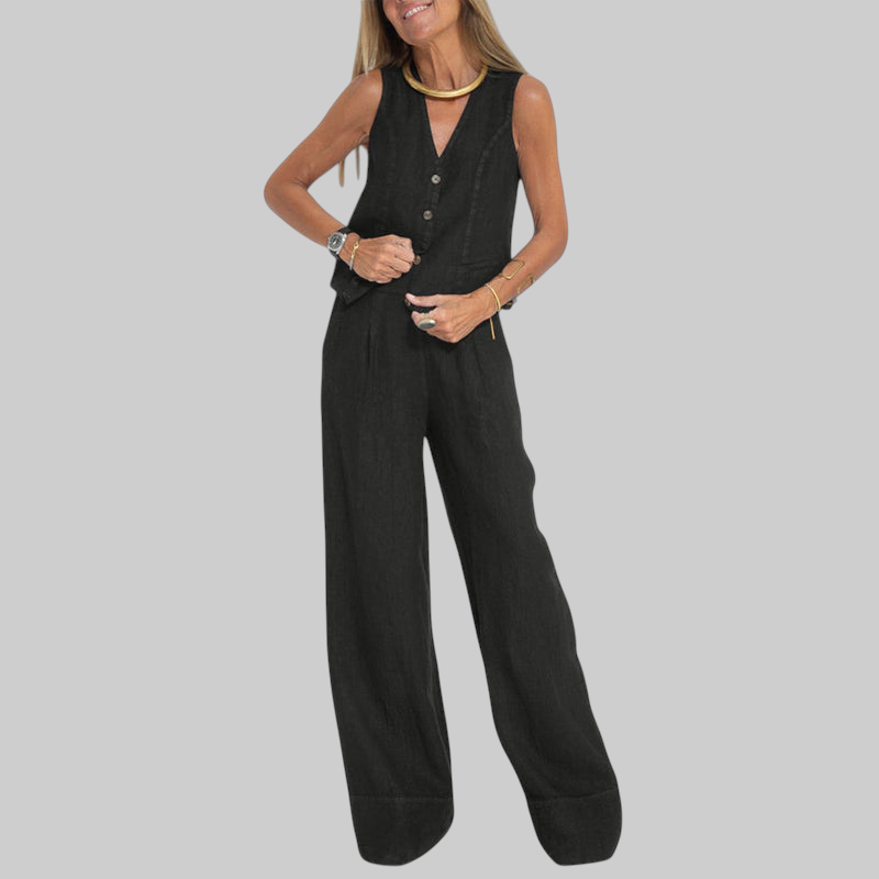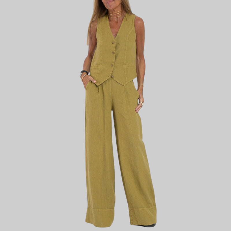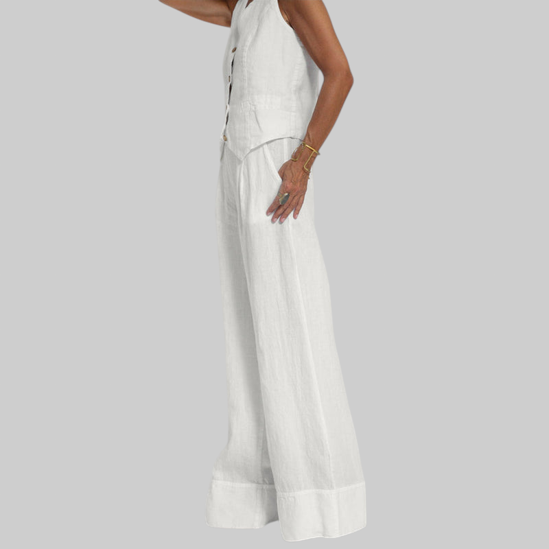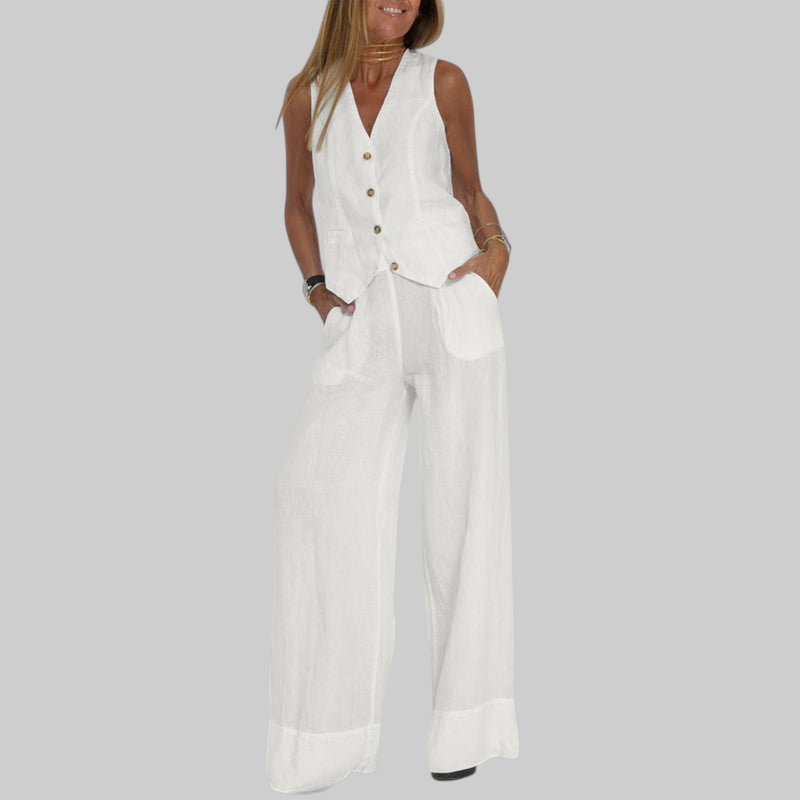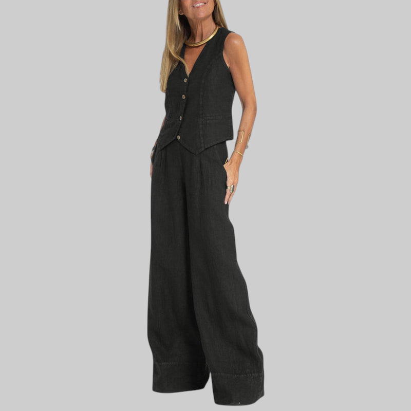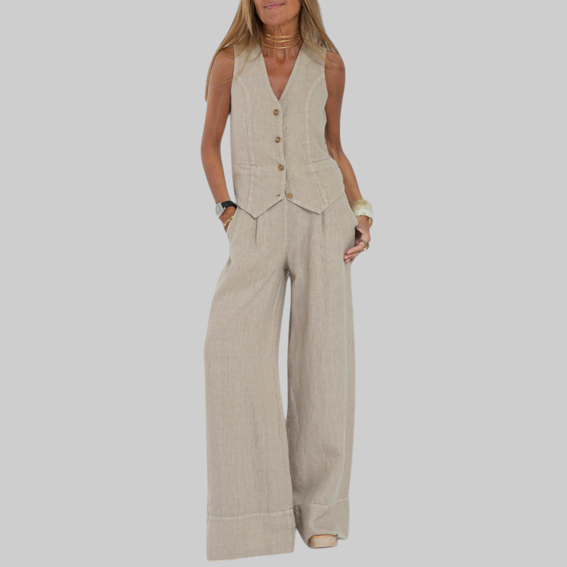 Kaksiosainen pellavasetti Martina on täydellinen valinta rennoille ja myös hieman virallisemmille tilaisuuksille kesän aikana. Sen elegantti leikkaus ja kevyt pellava tarjoavat mukavuutta sekä ajattoman tyylin – ihanteellinen kuumiin kesäpäiviin ja tyylikkäisiin iltaisiin tapahtumiin.