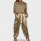 Tämä kaksiosainen setti on valmistettu hengittävästä, pehmeästä kankaasta. Se tarjoaa tyylikkään ja monikäyttöisen asun, joka sopii sekä päivään että iltaan. Puolipitkä pusero tuo asuun hienostunutta eleganssia, kun taas väljät housut takaavat maksimaalisen mukavuuden ja liikkumisen vapauden.
