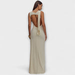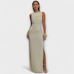 Imarteleva drapeeraus vyötäröllä ja rohkea halkio korostavat tyyliäsi, ja avonainen selkä tuo kokonaisuuteen ripauksen glamouria. Yhdistä mekko siroihin sandaaleihin ja näyttäviin koruihin saadaksesi ylellisen iltalookin, tai viimeistele asu hillityillä asusteilla minimalistisen tyylin saavuttamiseksi.
