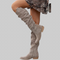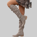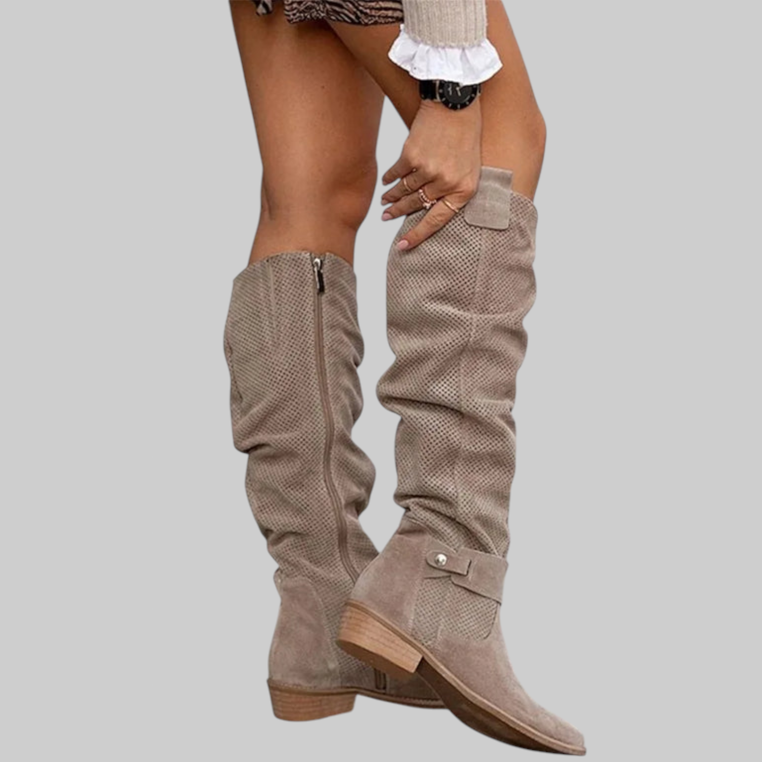 Vintage-henkeä modernilla twistillä, suunniteltu herättämään huomiota jokaisella askeleella. Nämä saappaat yhdistävät boheemin vapauden hienostuneeseen käsityötaitoon. Pehmeästä mokkanahasta valmistetuissa saappaissa on joustava ja teksturoitu päällinen, jota koristaa kivimäinen kuviointi, joka antaa niille käsintehdyn viehätyksen. Matala korko takaa käyttömukavuuden koko päiväksi, kun taas sivuvetoketju ja varvassolki lisäävät ripauksen hienostuneisuutta. Elegantti teräväkärkinen viimeistely tarjoaa täydellisen tasapainon käytännöllisyyden ja tyylin välillä.