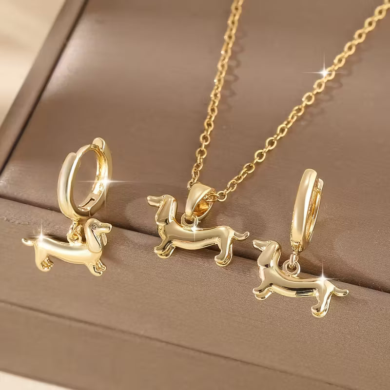 Sisältää mäyräkoira-kuvioidun kaulakorun sekä yhteensopivat korvakorut.