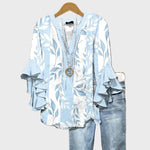 Piristä kesätyyliäsi tällä vaaleansinisellä paidalla, jota koristaa elegantti valkoinen lehtikuvio. Romanttiset röyhelöhihat tuovat liikettä ja naisellisuutta, kun taas mukava leikkaus tarjoaa keveyttä ja tyylikkyyttä koko päiväksi.