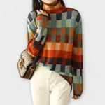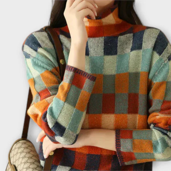 Tämä mukava ja tyylikäs neule erottuu eloisalla ruutukuosillaan. Korkean kauluksen ja imartelevan leikkauksen ansiosta se on näyttävä vaate, joka täydentää helposti mikä tahansa asun.