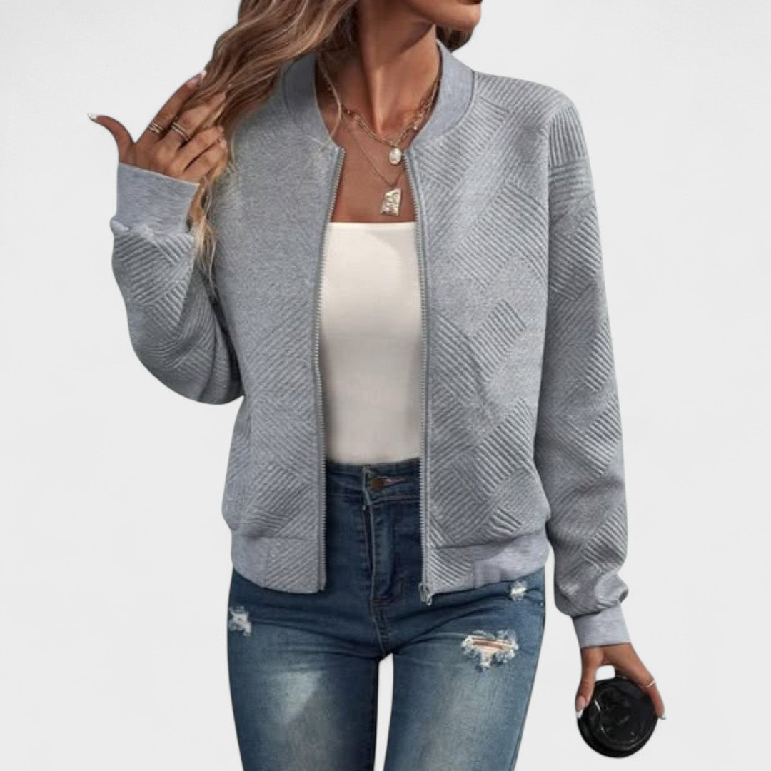 Bomber Dora tuo modernin vivahteen ajattomaan klassikkoon. Hienovaraisella geometrisella kuosilla, käytännöllisellä etuvetoketjulla ja resorimanseteilla täydellistä istuvuutta varten, se on kevyt ja ihanteellinen yhdisteltäväksi minkä tahansa tyylin kanssa – farkuista mekkoihin – ympäri vuoden.