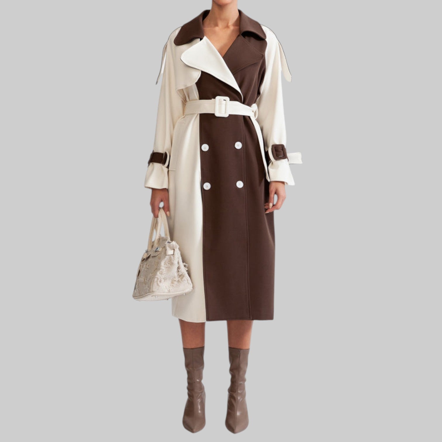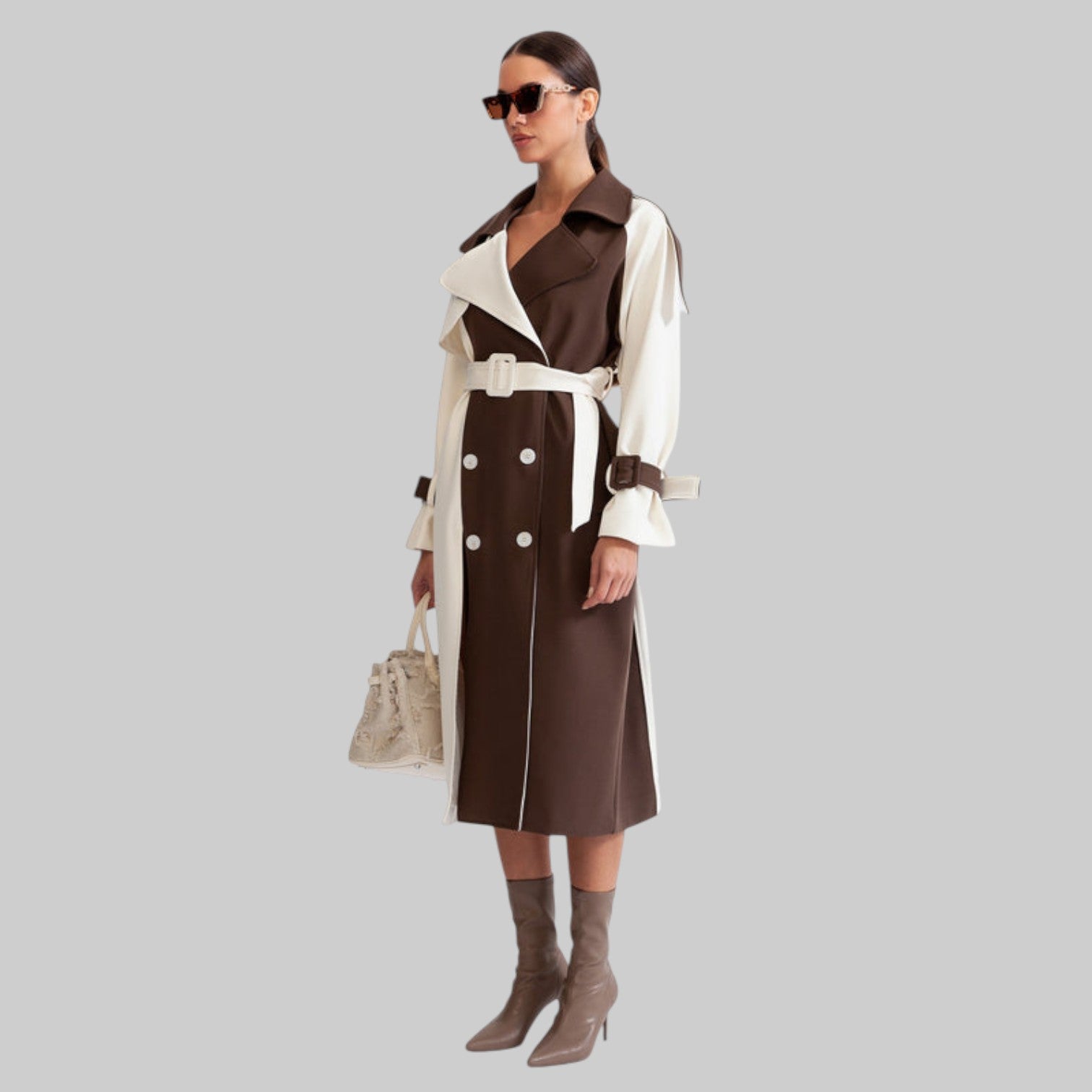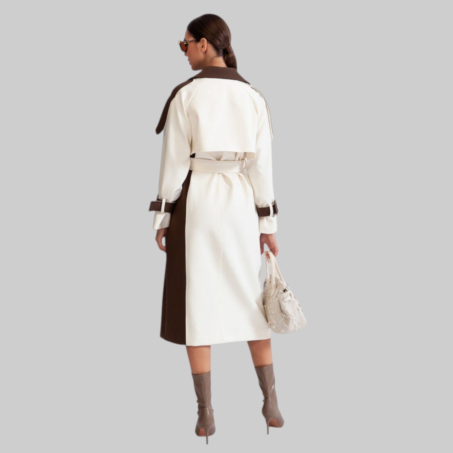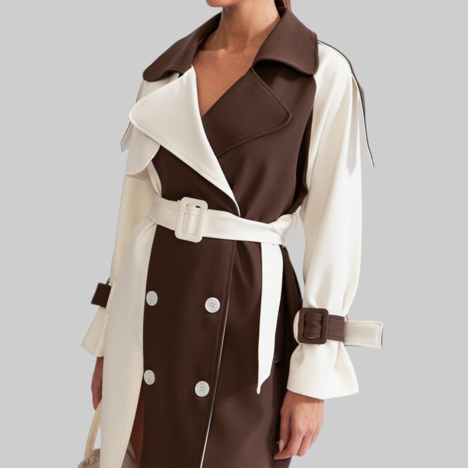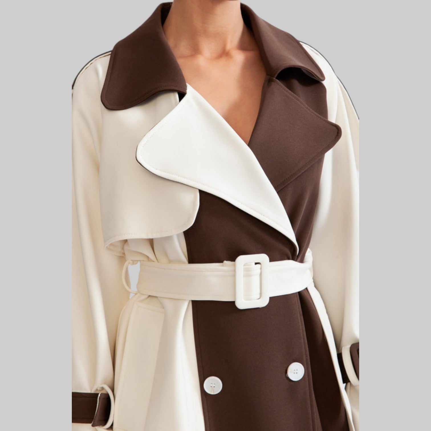 Tämä klassinen trenssitakki tarjoaa ajattoman ja elegantin ilmeen väriblokkisuunnittelun ansiosta – kermanvärinen ja ruskea. Tyylikkäästä kankaasta valmistettu takki sisältää kaikki olennaiset yksityiskohdat: vyön vyötäröllä, sivutaskut, säädettävän vyön ja nappikiinnityksen. Pukeudu vaivattoman tyylikkäästi.