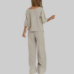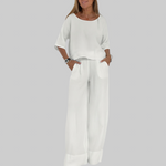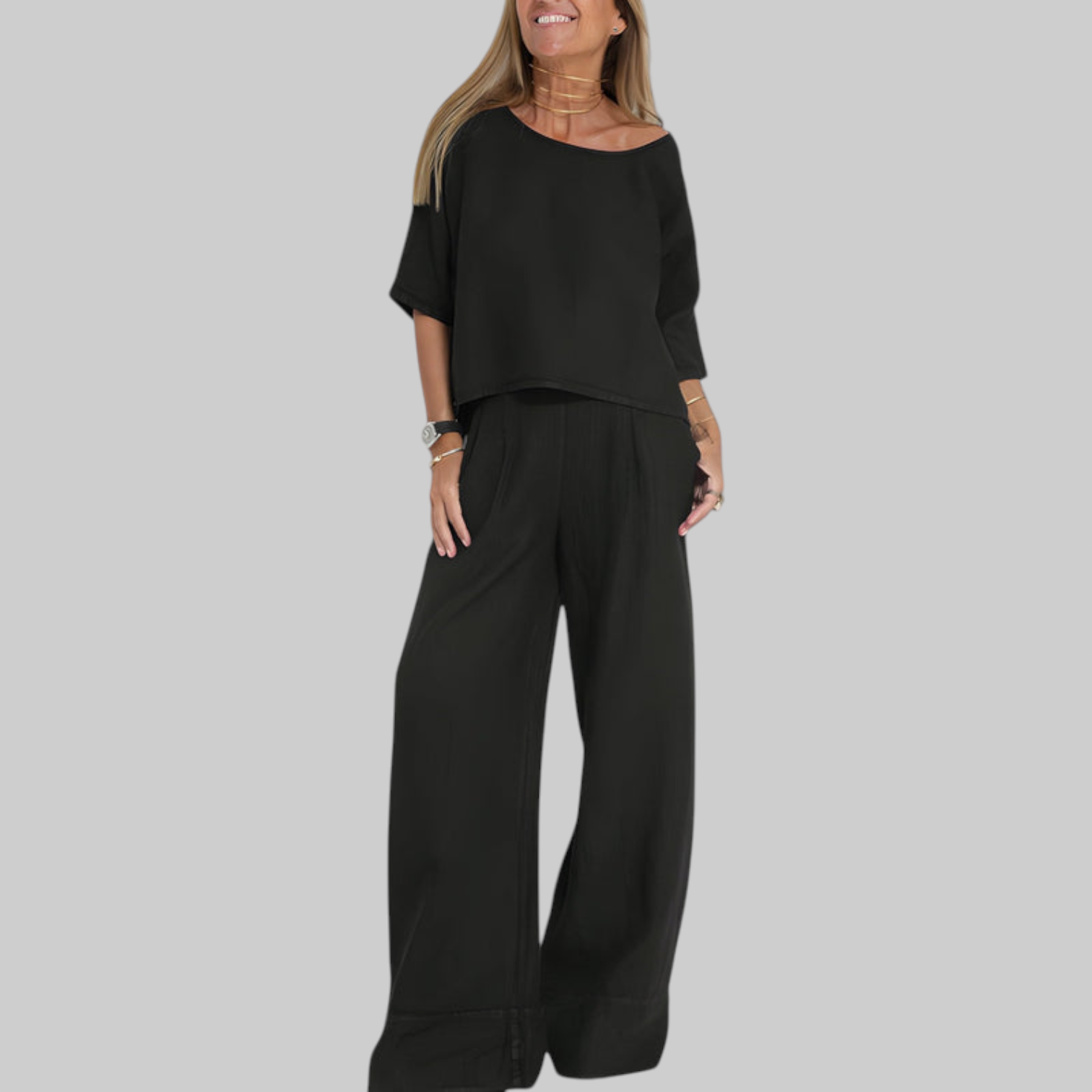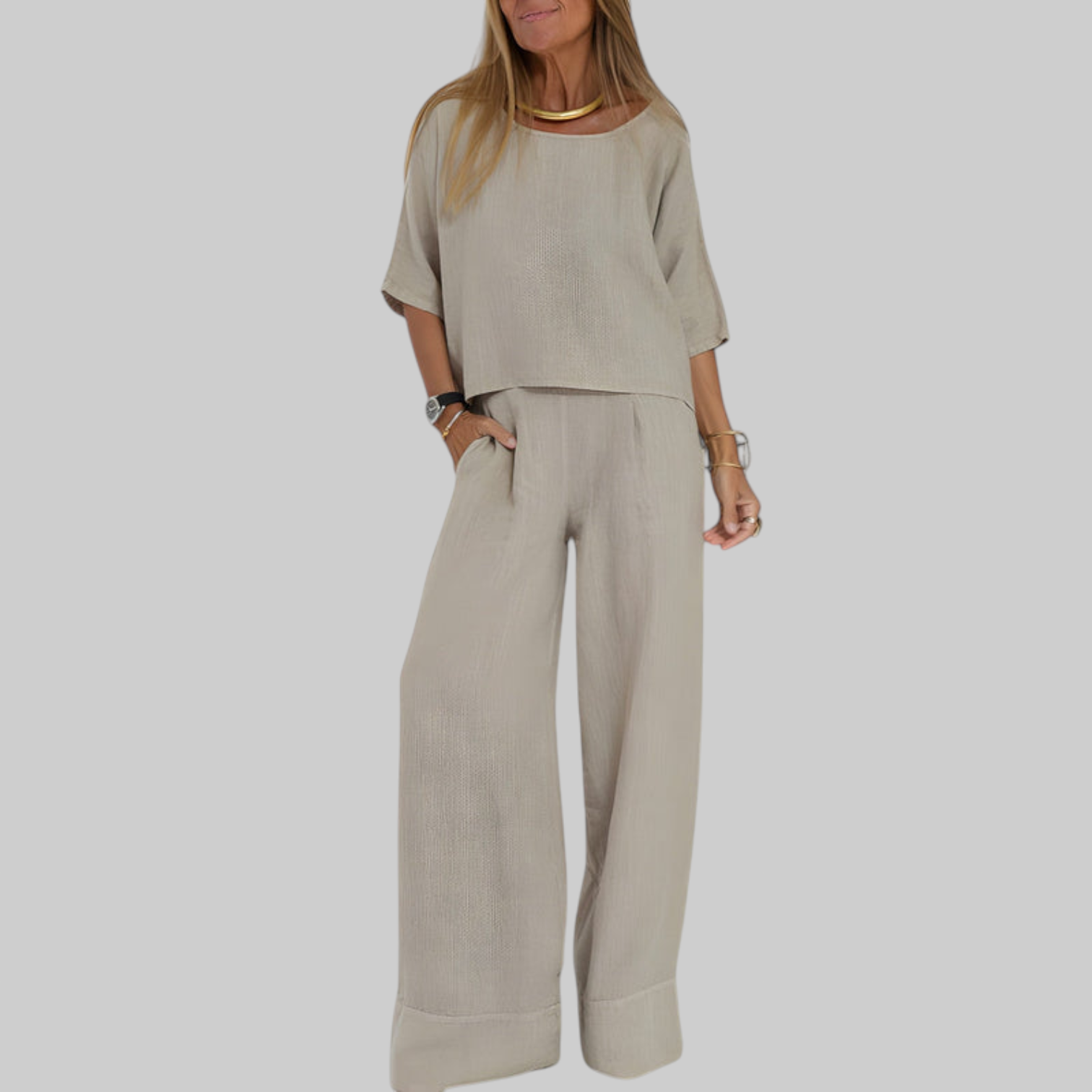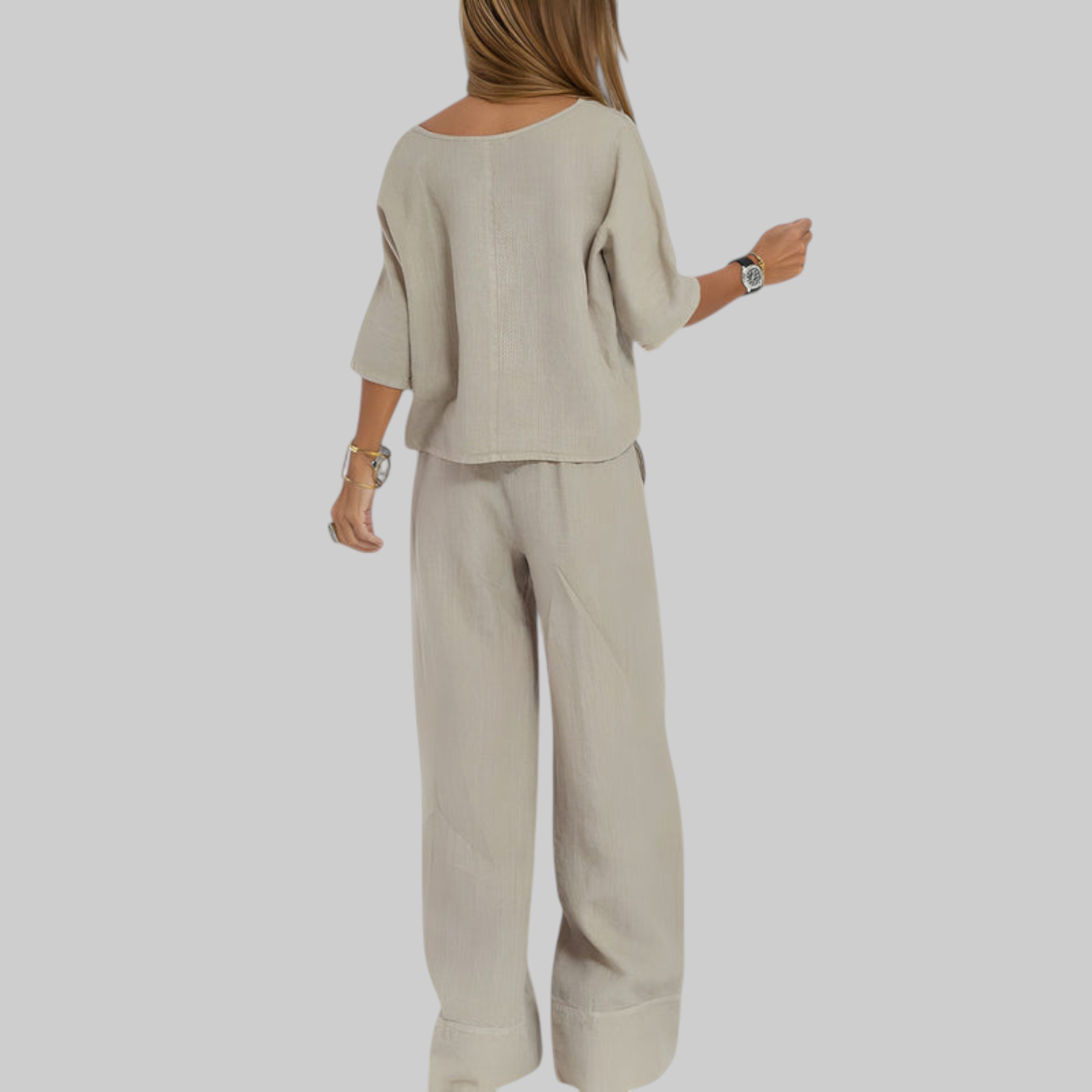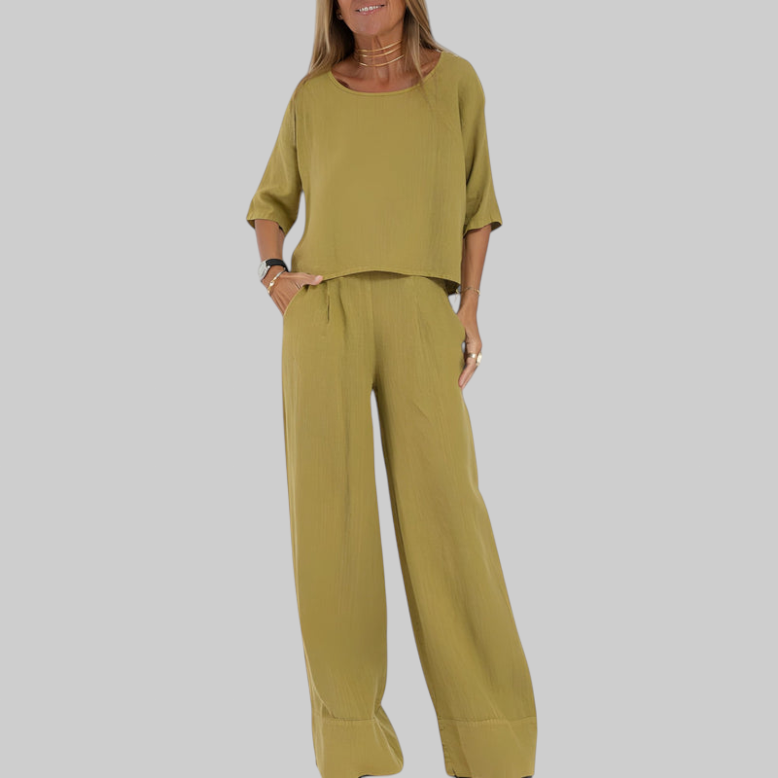 Alina puuvilla- ja pellavasarja yhdistää keveyden ja eleganssin. Tämä monikäyttöinen asusetti on täydellinen sekä arkisiin että juhlaviin tilaisuuksiin – luonnonmateriaalit takaavat mukavuuden ja hengittävyyden koko päivän ajan.