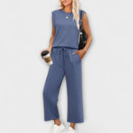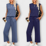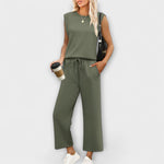 Astut tyyliin, pysyt mukavuudessa! Tämä kaksiosainen vapaa-ajanasu on ihanteellinen asioiden hoitoon, kahvihetkiin tai spontaaneihin viikonloppusuunnitelmiin. Setti on suunniteltu imartelemaan ja laskeutumaan kauniisti: pitkähihaisella paidalla ja leveälahkeisilla, lyhyemmillä housuilla saat sekä liikkuvuutta että tyylikkyyttä.